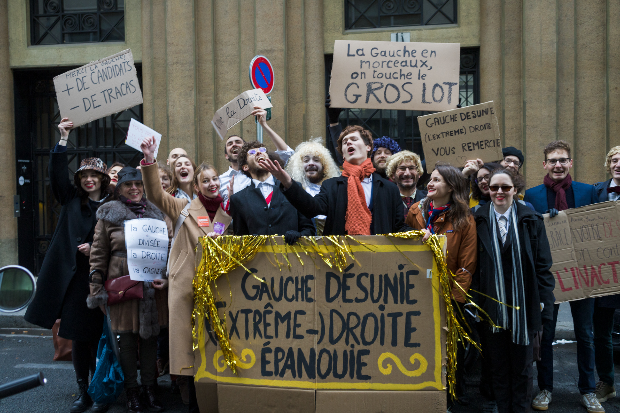 “Merci la gauche ! Plus de candidats, moins de tracas !” “Gauche désunie, (extrême-) droite épanouie”. “La gauche en morceau, on a touché le gros lot !” Ce 28 novembre, une manifestation satirique a surpris les sièges de La France Insoumise, Europe Écologie Les Verts et du Parti socialiste, à Paris. Déguisés en partisans de droite, pancartes au poing, des activistes sont venus remercier ces trois partis pour leurs divisions, offrant à Marine Le Pen ou Emmanuel Macron un boulevard à la présidentielle 2022.