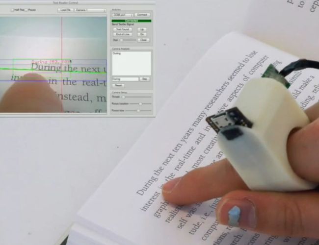 Sertie d’une micro caméra, la bague embarque un logiciel d’analyse et de synthèse vocale. Il suffit à l’utilisateur de poser son doigt sur le texte. Le logiciel suit ensuite ses mouvements pour identifier les mots. Si le lecteur dévie de sa trajectoire, la bague émet un signal sonore l’informant que son doigt n’est plus sur la bonne ligne. Le « Finger Reader » envoie également des vibrations lorsque le texte est terminé pour lui indiquer qu’il doit aller à la ligne suivante. Les mots sont alors convertis en temps réel et une voix synthétisée les formule.