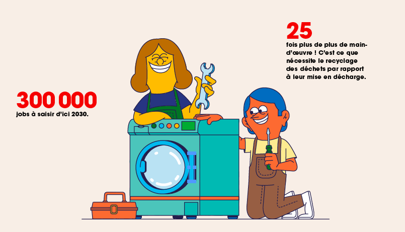 Côté projections chiffrées, il y a de quoi s’enthousiasmer. Une étude produite en 2015 par l’Institut de l’économie circulaire, conjointement avec le Club de Rome (groupe de réflexion international sur le développement durable), prévoit 200 000 à 400 000 emplois créés en France par l’économie circulaire d’ici 2030. La feuille de route gouvernementale dévoilée en 2018 vise d’ailleurs pile entre ces deux projections, avec un objectif de 300 000 emplois supplémentaires.