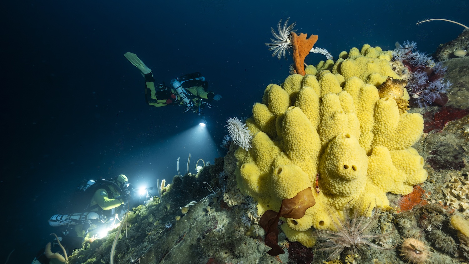 Nous avons identifié deux forêts animales marines. Ce sont des structures composées d’organismes fixés – éponges, coraux, bryozoaires – qui forment de véritables architectures tridimensionnelles. La richesse est remarquable. Sans éclairage, tout semble bleu sombre. Mais dès que nous éclairons avec nos lampes, les couleurs apparaissent. Des couleurs que personne n’imagine.