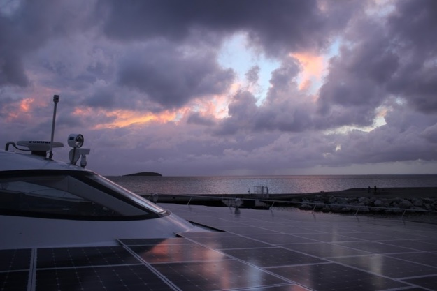 La plus grosse différence entre un bateau solaire et un bateau classique, c’est que nous devons tenir compte de l’ensoleillement plus que du vent. Le bateau possède des batteries qui lui offrent environ trois jours d’autonomie. Il nous faut donc adapter la consommation électrique des moteurs à la quantité d’énergie produite.