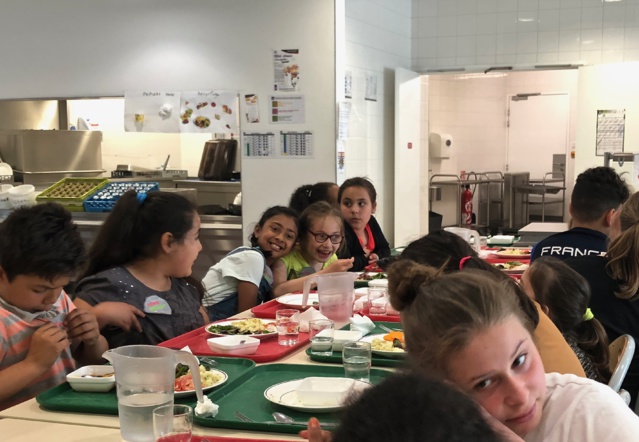Pour le premier service, les “petits” ont des plats posés sur la table dans lesquels ils se servent. Les “grands” ont un self, avec le choix de la petite ou de la grande assiette. S’ils ont encore faim, ils se resservent, plutôt que de prendre une grosse portion dès le départ.