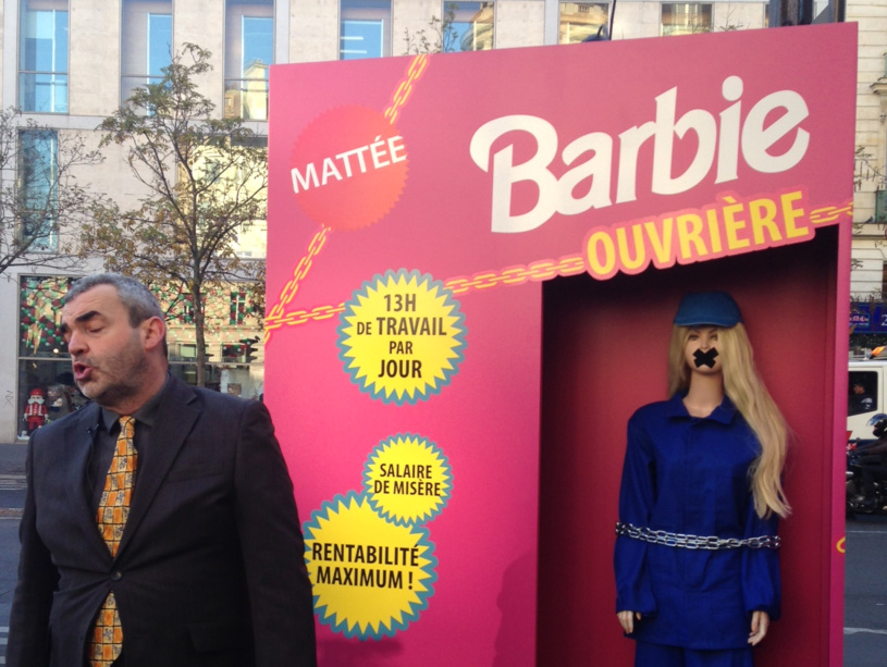 « Approchez Mesdames et Messieurs, approchez ! » Devant le JouéClub de Richelieu-Drouot, dans le IXe arrondissement de Paris, on vante à la criée un jouet pas comme les autres : Barbie Ouvrière. « 13 h de travail par jour, fonctionne sans protection sociale ! », peut-on lire sur l’emballage rose bonbon planté sur le trottoir. Pas comme les autres ? Pas si sûr.