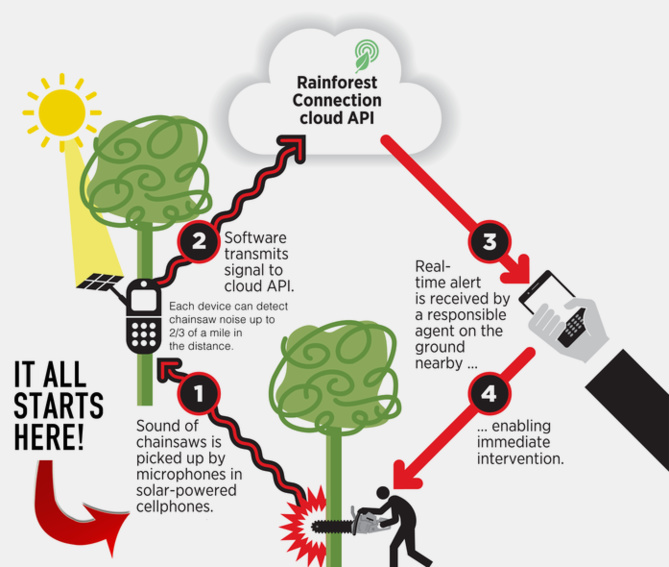 L’idée ? Utiliser une partie des 720 millions de téléphones portables jetés chaque année pour équiper les arbres de mouchards connectés. Les micros des mobiles récupérés servent ici de capteurs auditifs : ils sont installés directement sur les arbres et peuvent capter des sons jusqu’à 1 km. Dès qu’un bruit suspect est détecté – tronçonneuse, coup de feu, cris d’animaux en détresse – une alerte est envoyée sur le serveur de Rainforest Connection, qui le transmet à un garde-forestier présent sur place : « Ainsi, [les gardes forestiers peuvent] identifier les activités illégales au moment où elles se produisent, tout en transférant les données librement et immédiatement à tous ceux qui le souhaitent, dans le monde entier », explique la société.