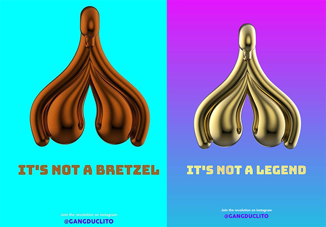 Elles ont créé plusieurs affiches colorées représentant en grand format le clitoris avec des slogans tels que “It’s not a bretzel” (ce n’est pas un bretzel), “It’s not a ghost” (ce n’est pas un fantôme) ou encore “It’s not a legend” (ce n’est pas une légende).