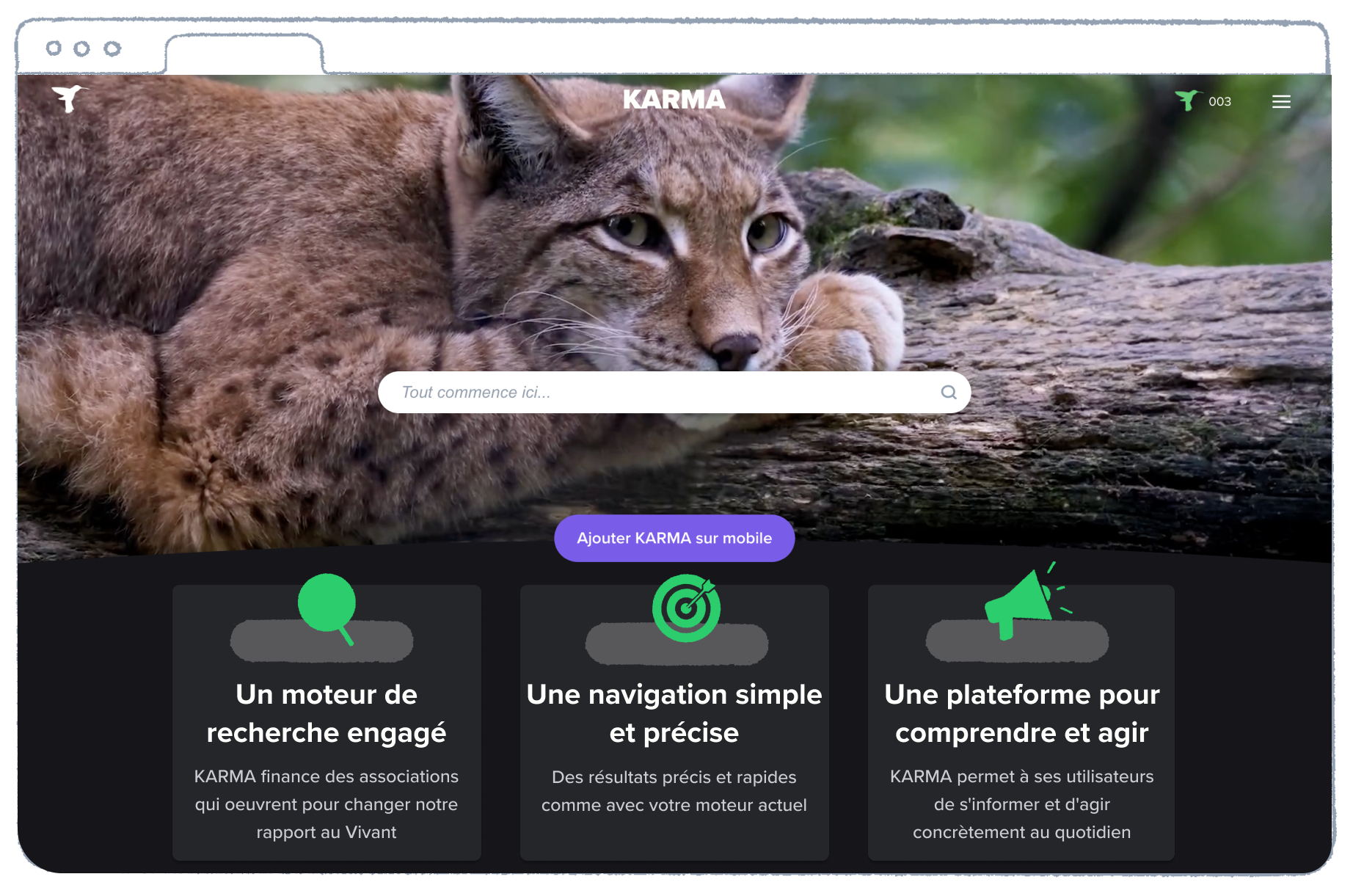 Un petit nouveau vient s’ajouter à la liste des moteurs de recherche vertueux : KARMA. Lancé le 22 mai dernier par Yann Kandelman et Antoine Maurel, KARMA finance des associations engagées pour la protection du Vivant et le bien-être animal. L’ASPAS, L 214 et Notre Affaire à Tous sont ainsi les trois premières associations partenaires de KARMA.