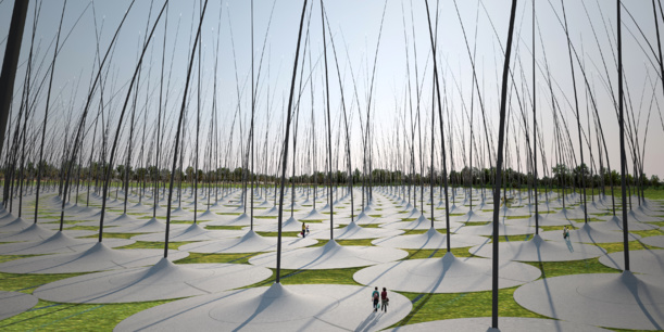 Mi-oeuvre d’art, mi-centrale électrique, le projet Windstalk a été conçu par l’agence américaine AtelierDNA pour la ville d’Abu Dhabi. Ce système sans pales se compose de tiges de 55 mètres, faites d’un mélange carbone-résine, et d’un diamètre s’affinant de 30 centimètres à la base jusqu’à 5 centimètres à l’extrémité. À l’intérieur des joncs, des disques en céramique piézo-électriques produisent du courant par friction. Mais cette installation produit aussi de l’électricité de deux autres façons : le torque du jonc est mis à contribution dans une chambre à la base de celui-ci, tandis qu’un système de pompes remplit des citernes, qui se vident en produisant de l’hydroélectricité lors des périodes sans vent.