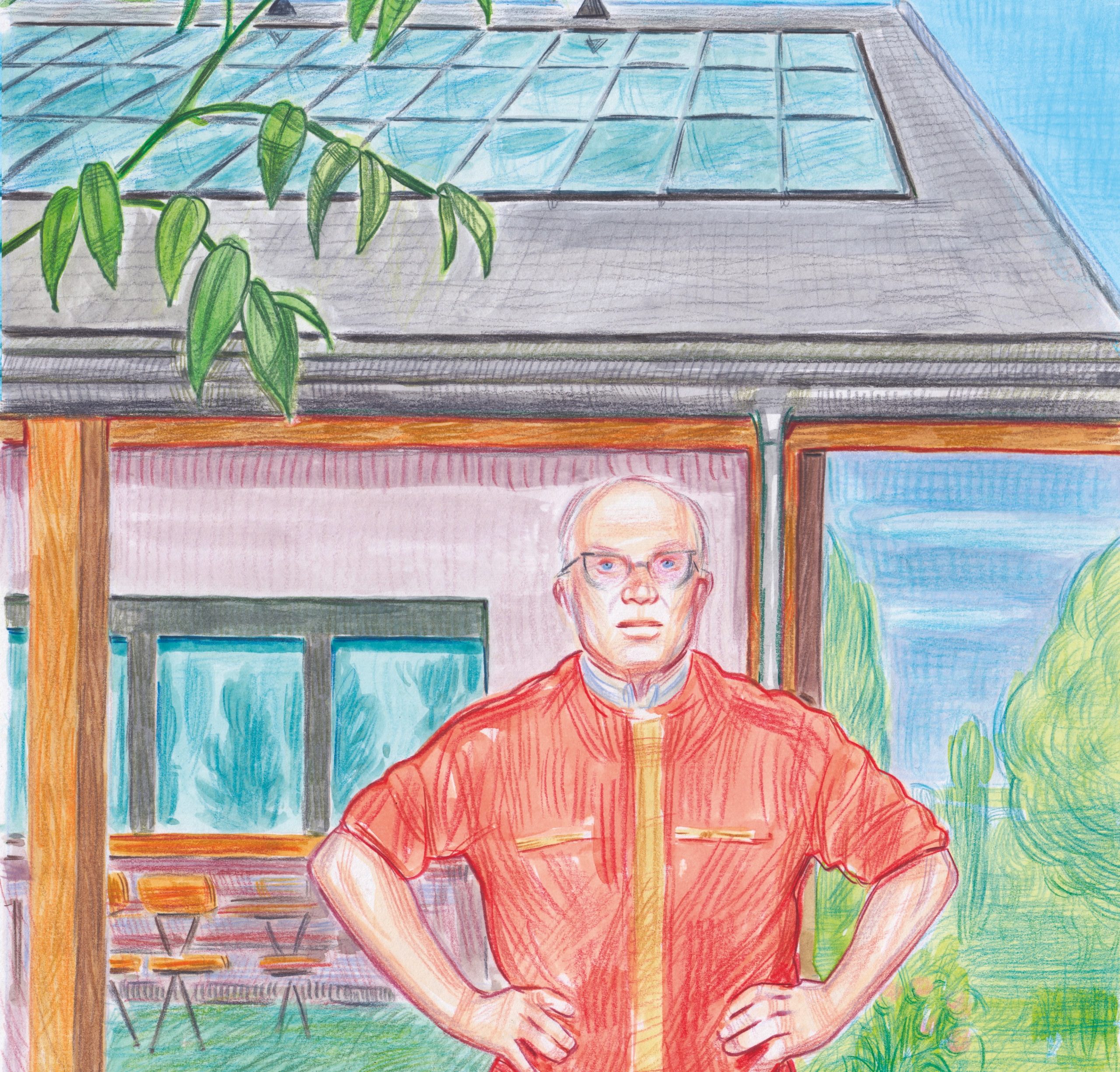 Sa maison de Trévignin, petit village savoyard situé sur les hauteurs d’Aix-les-Bains, est l’œuvre “la plus complexe” qu’il ait pu imaginer. Près de 50 m2 de capteurs solaires sur les toits, un bâtiment ancien rénové, une deuxième habitation accolée et réalisée à partir d’un ancien garage. Bienvenue chez André Jean, l’un des pères fondateurs de l’énergie solaire thermique, un vrai Géo Trouvetou.
