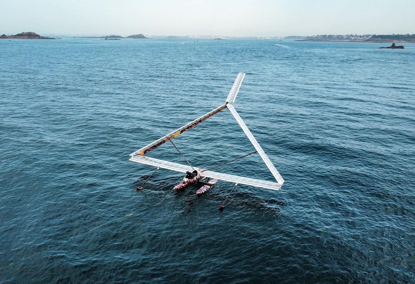 Difficile de savoir exactement comment qualifier cet engin hors du commun. Pour le fabriquer, il a fallu “1000km de fil de carbone, 10 paires de bras et 2 ans de travail”. Au total, l’engin pèse 150 kilos. Composé de deux flotteurs à la base, il est surmonté d’une cabine de pilotage minimaliste équipée d’une dérive. Accrochées à cette cabine, deux ailes horizontales d’une envergure de 13 mètres sont dotées de flotteurs.