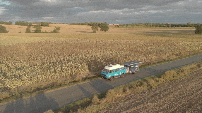 Aux côtés d’Alexandra Perfettin, sa coéquipière qui a depuis quitté l’aventure, Rémi a entièrement assuré le “rétrofit” de son van, c’est-à-dire sa transformation de véhicule à moteur thermique en véhicule électrique. Il utilise pour cela des batteries d’occasion, stockées sous le châssis afin de gagner de l’espace, et conçoit une remorque solaire qui permet de les recharger n’importe où.
