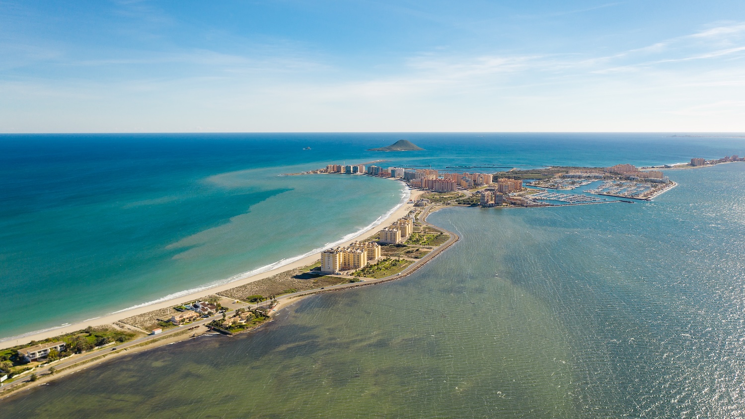 Vue aérienne du banc de sable de la Mar Menor, une langue de terre côtière de la Mar Menor, dans la région de Murcie, en Espagne. Cette bande de 21 km de long sépare la mer Méditerranée de la lagune de la Mar Menor. - © alexemarcel / stock.adobe.com