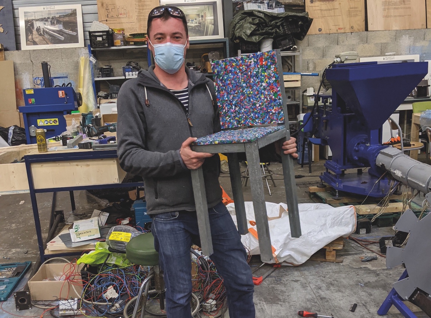 J’attaque ensuite les pieds de ma chaise. Tom me guide dans l’utilisation de l’extrudeuse. Elle se compose d’un grand entonnoir, d’un moteur et d’une vis sans fin qui pousse le plastique à travers un tube chauffé par des résistances. Une sorte de machine à churros aux airs de canon laser. À sa sortie, on place des tubes métalliques dans lesquels coule le plastique fondu et on obtient des perches de 2 m de section ronde ou carrée. Malheureusement pas multicolore mais gris car les couleurs se sont mélangées dans la machine. Je note au passage que le plastique se travaille comme le bois. Quelques coups de scie et de visseuse plus tard, j’ai une belle chaise au plateau multicolore et aux longues jambes grises. Ce qui lui donne un aspect un peu plus chic que je ne l’espérais.