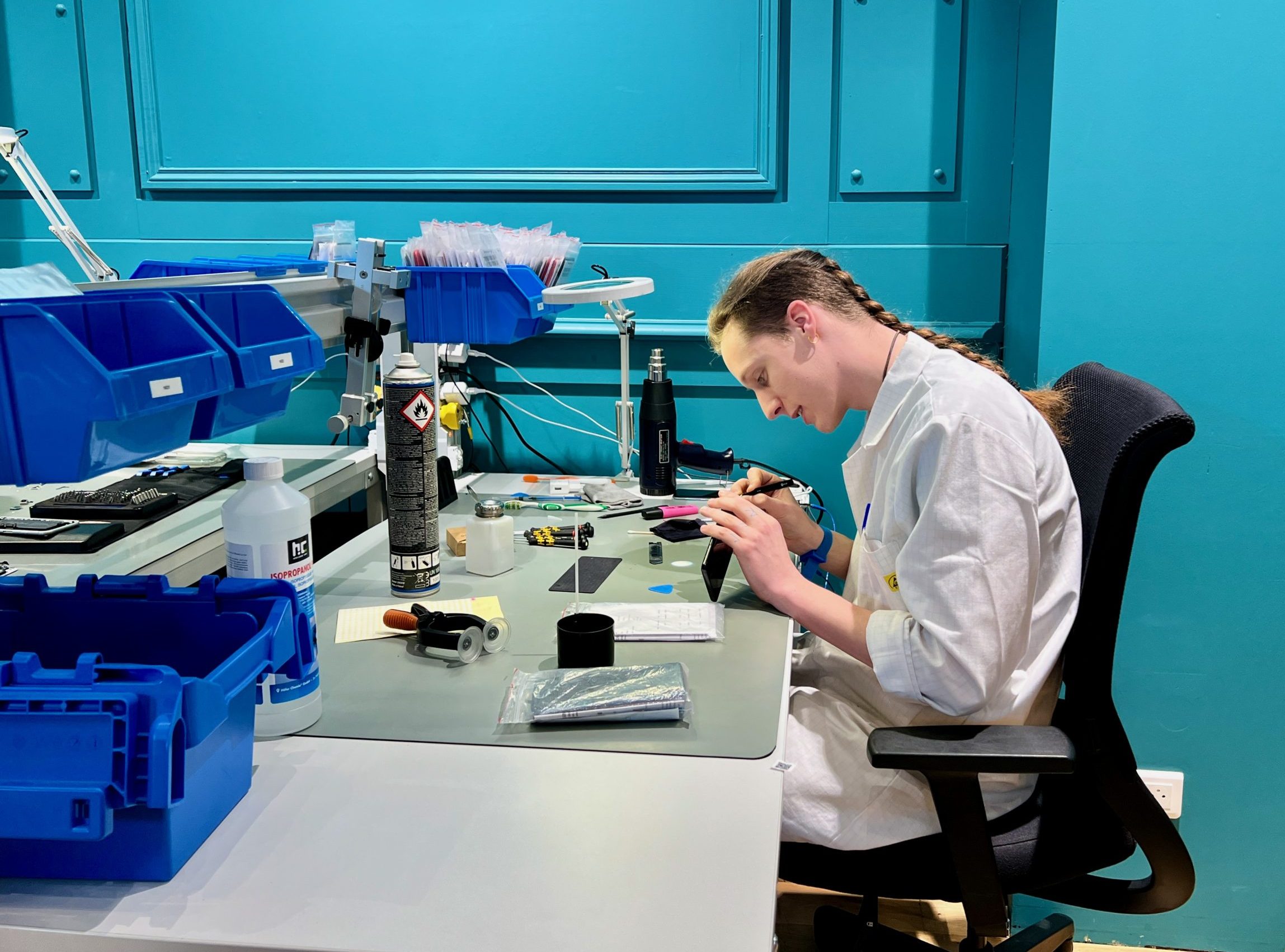 C’est pour cela que YesYes a mis son atelier au coeur de sa boutique, visible de tout le monde et ouvert à la visite. Dans cet espace, chaque produit récupéré est évalué sous toutes ses fonctionnalités. Comment ? Via un double test logiciel et physique d’une dizaine de minutes, et qui compte 42 points de contrôle. Un logiciel ad hoc grade l’état de fonctionnement global, pointe les anomalies et vérifie l’état de la batterie. Si celle-ci est en-dessous de 85 % de ses capacités initiales, elle sera alors systématiquement remplacée.