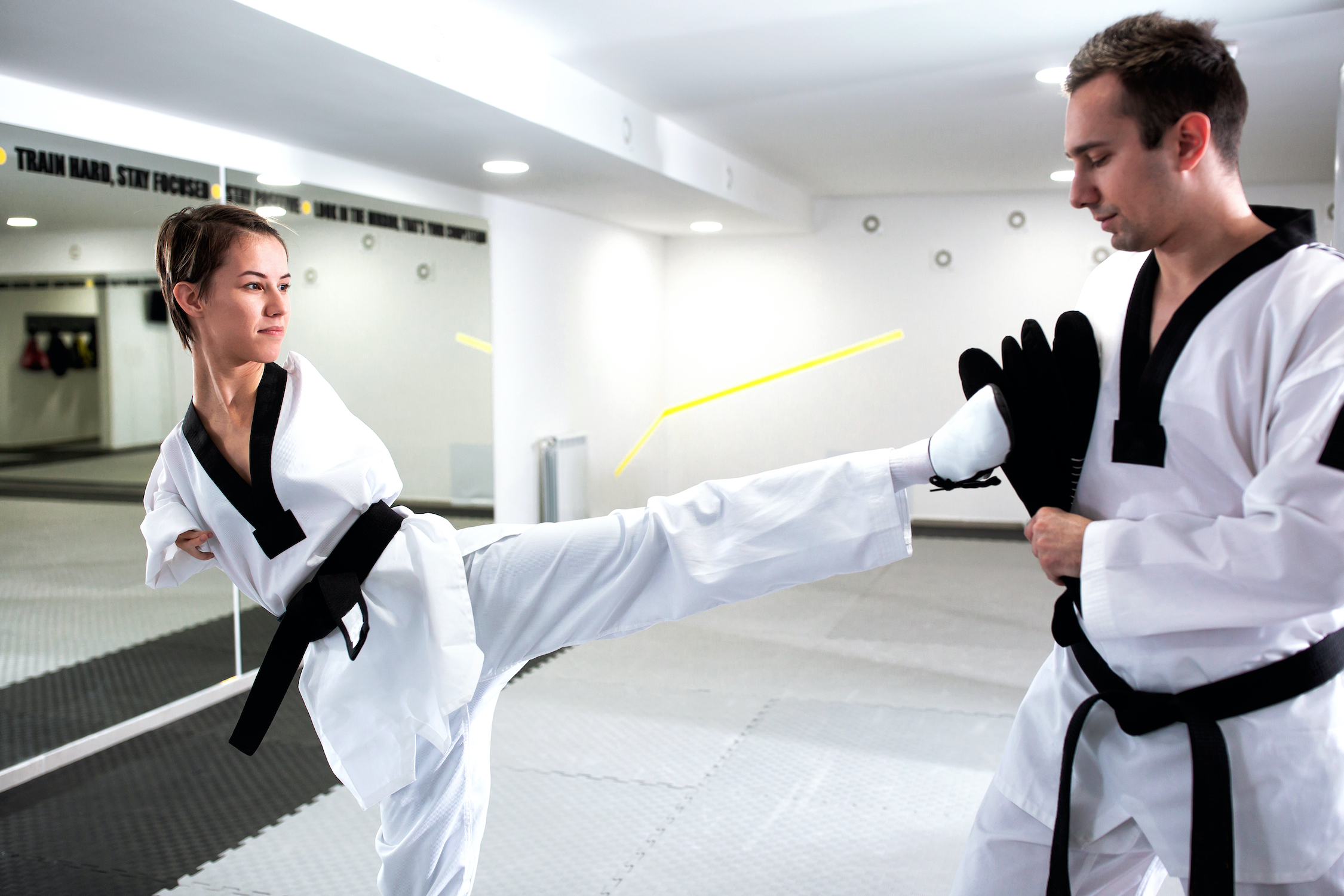 Les compétitions se déroulent sur trois rounds de deux minutes. Les athlètes marquent des points à chaque coup de pied porté sur le plastron de l’adversaire, c’est-à-dire leur protection de torse. Celui-ci est muni de capteurs électroniques qui permettent de valider les coups.