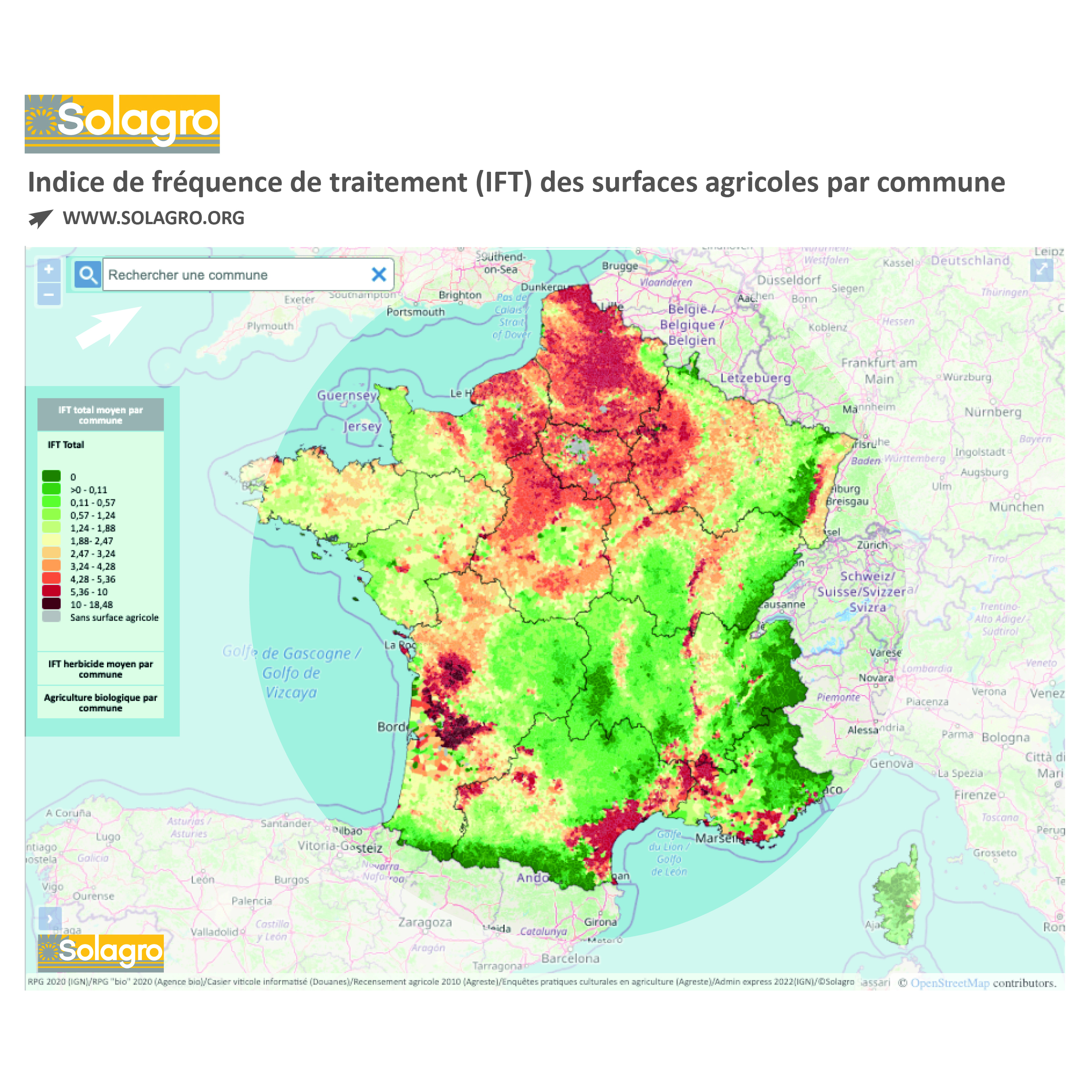 La carte est précise à l’échelle communale. Elle détaille le type de cultures et le type de traitements (herbicide, insecticides, fongicides, traitements de semences…). Elle affiche aussi l’ampleur de l’utilisation de produits phytosanitaires. On parle alors de l’indice de fréquence de traitement phytosanitaire (IFT).