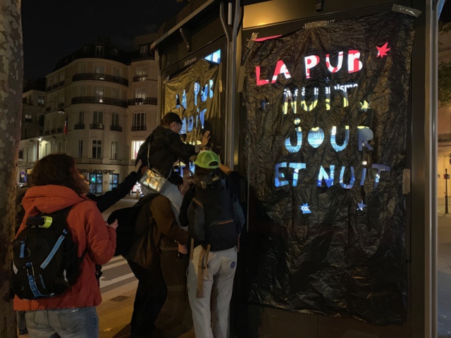 Tanguy nous explique alors la technique du “recouvrement”, assez simple (même si elle nécessite parfois d’avoir recours à la courte échelle) : en quelques minutes, il tapisse un écran d’une grande bâche noire, découpée pour laisser apparaître des messages, comme “La pub nuit jour et nuit” ou encore “zéro watt pour la pub”.