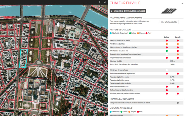 Cette fiche renseigne différents critères, comme la surface bâtie, la ventilation de l’îlot, la hauteur du bâti, l’ombrage lié aux arbres, la présence d’eau… Chaque critère est évalué par une couleur en fonction de son effet de chaleur, le jour et la nuit.