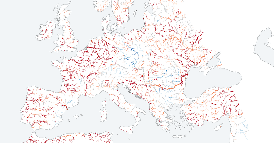 Copernicus a dévoilé une carte animée de l’évolution des principaux cours d’eau en Europe. Les nuances de bleu indiquent une décharge plus élevée. Quant aux nuances de rouge, elles indiquent une décharge inférieure à la normale. Le gris indique une décharge proche de la moyenne. Le mois d’août a été particulièrement dur en termes de débits des fleuves et rivières.