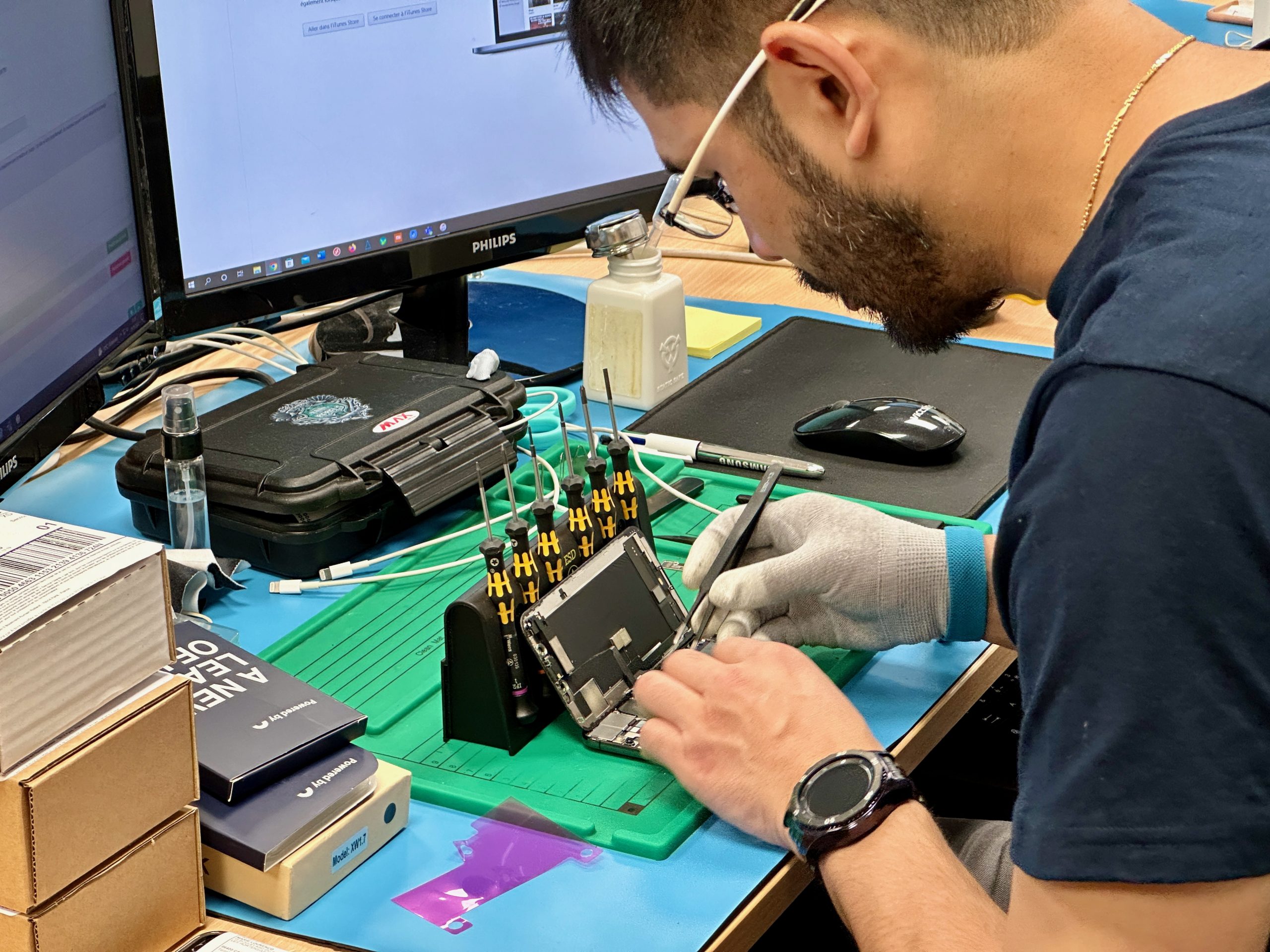 Mais un produit reconditionné n’est pas exempt de défaut. C’est ainsi que Save sert de prestataire pour la plateforme Back Market. Elle voit arriver au sous-sol de son nouveau magasin parisien les smartphones en panne mais encore sous garantie de prestataires passant par Back Market mais qui ne veulent pas gérer le service après-vente directement. Soit pour des raisons de capacité, soit parce qu’ils sont basés à l’étranger et que cela ne serait pas rentable ni assez rapide. “Ce n’est pas très rentable mais c’est une stratégie sur le long terme : on espère que les personnes qui seront passées par nous pour une réparation reviendront la fois suivante car ils auront été satisfaits”, détaille Charles Bocquillon.