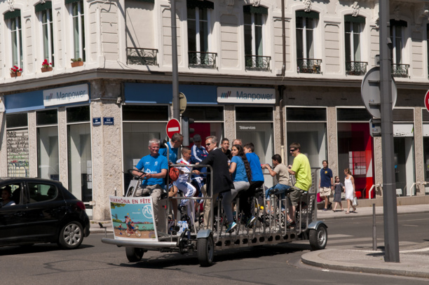 Les noms des entreprises impliquées sont encore tenus secrets. « On a développé une technologie de mutualisation de l’énergie humaine unique et écologique qui est d’ailleurs brevetée. Elle permet de déplacer par la seule force des jambes des véhicules qui pèsent plus de deux tonnes une fois les passagers embarqués », affirme Phil Rouyer, qui chapeaute le projet depuis le départ.
