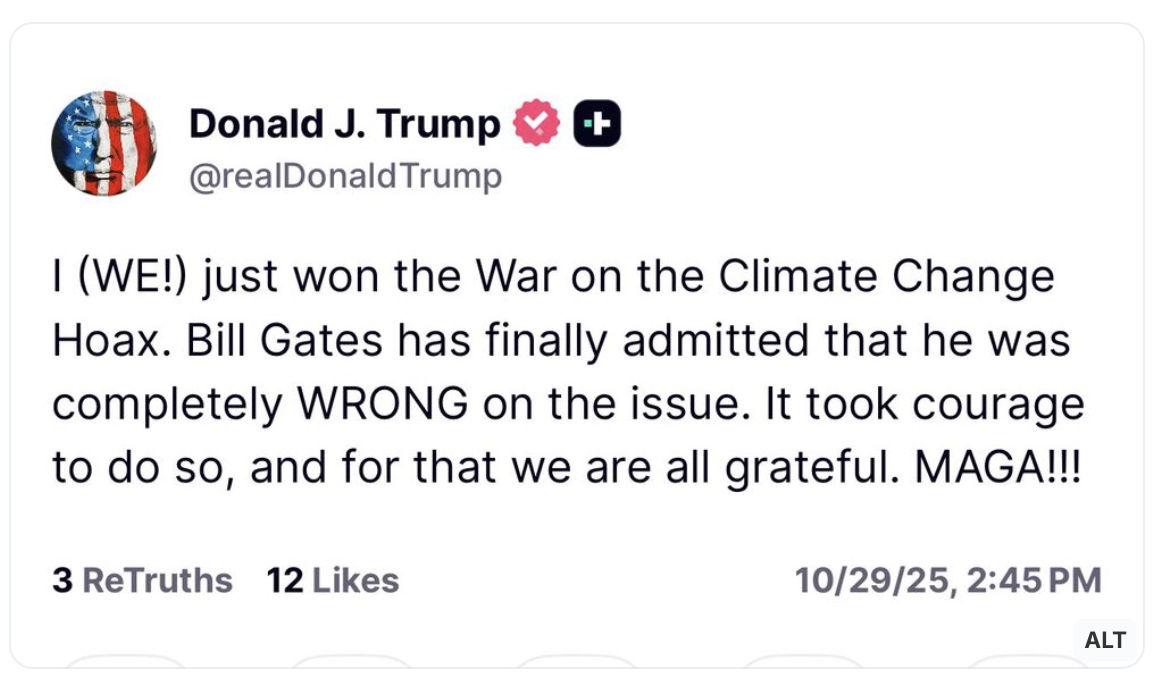 Un raisonnement séduisant sur le papier, mais profondément problématique. Car derrière le vernis humaniste, Bill Gates déroule un discours typiquement techno-solutionniste : la clé, selon lui, réside dans la baisse du “green premium”, ce surcoût qui rend les technologies propres moins compétitives que les fossiles. En clair, tout dépendrait de notre capacité à innover, investir, et produire plus efficacement. Pas de remise en cause des modes de vie, ni de réflexion sur la sobriété : le salut viendra des laboratoires et des start-up. Bref, le changement climatique, ne serait pas si grave que ça. Une prise de position saluée par… Donald Trump, qui souligne avoir gagné “la guerre contre le canular du changement climatique”.